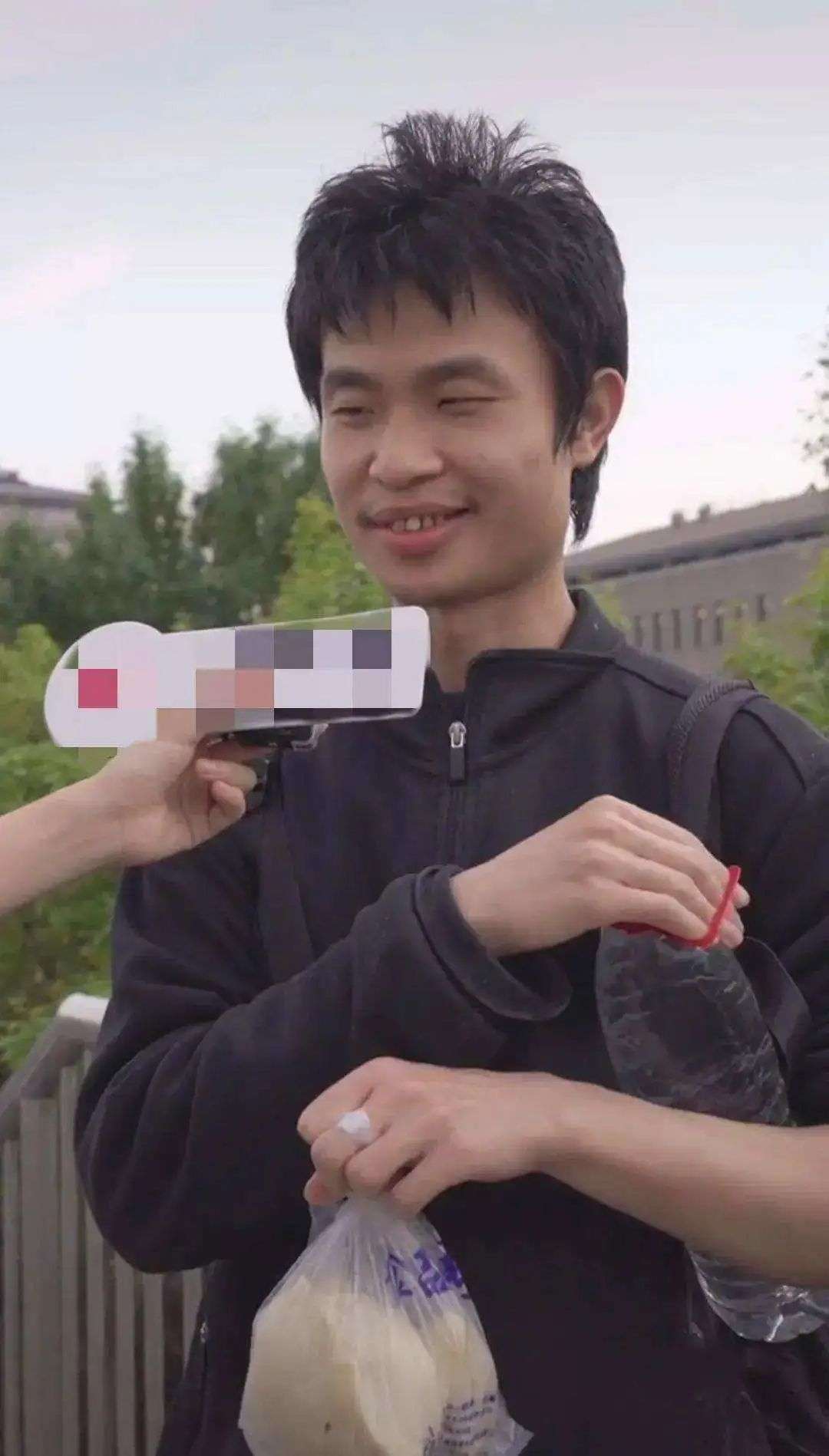 那天,他穿黑色外套,背双肩包,怀里抱一个撕去标签的矿泉水瓶,手上还拎着两个馒头,看起来像一个紧张羞涩的大学生。