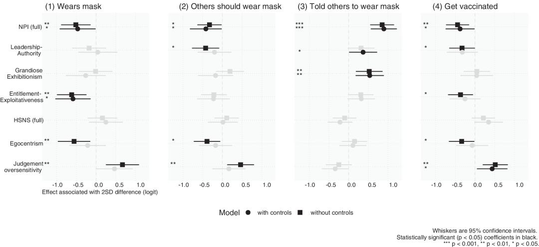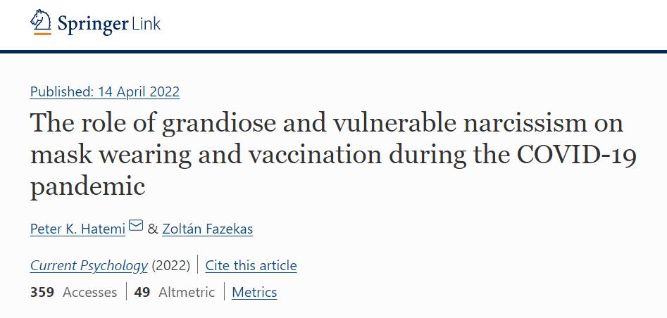 图 | 在 COVID-19 大流行期间,自恋对戴口罩和接种疫苗的影响(来源:Current Psychology)