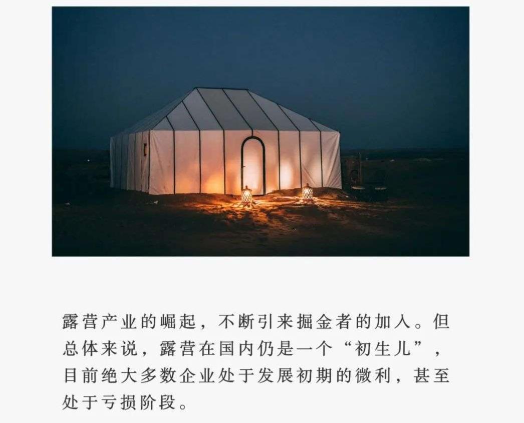 露营产业的崛起,不断引来掘金者的加入。但总体来说,露营在国内仍是一个“初生儿”,目前绝大多数企业处于发展初期的微利,甚至处于亏损阶段。