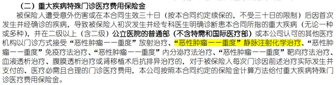 市场上很多百万医疗险都包含 特殊门诊医疗费用保障责任,保障内容包括 放射治疗、化学治疗、免疫疗法治疗、内分泌疗法治疗、靶向疗法治疗、门诊肾透析治疗、器官移植后的门诊抗排异治疗 等。