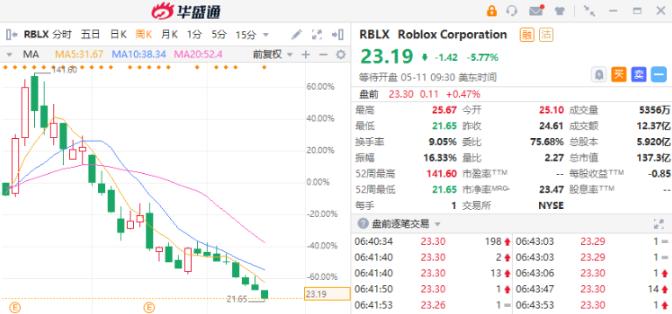 财报显示,Roblox 第一季度销售额增长 39%至5.3亿美元,不及市场预期的6.46亿美元。该公司报告其净亏损扩大至 1.6 亿美元。Roblox最新收盘价为23.19美元,自高点141.6美元以来已经下跌了82.79%。