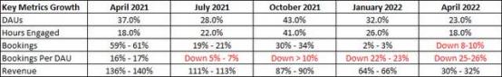 在疫情爆发期间,Roblox的增长速度是令人吃惊的,但从另一方面来看,欧美普遍放开出行限制后,用户的游玩时间出现显著下降也是不可避免的。在给股东的一封信中,Roblox也证实了这一点:与2021年Q1相比,每日活跃用户在Roblox上花费的时间比起之前更少了,而公司的收入与用户花费的时间高度相关。