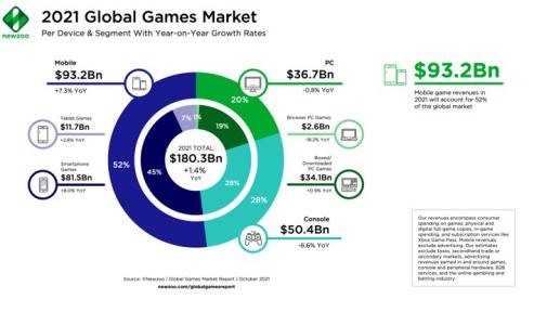 根据市场研究机构Newzoo的统计数据,2021年全球游戏市场产生1803亿美元,增长约22.5亿美元,同比增长1.4%,手游占比达到了52%,增长63.4亿美元,同比增长7.3%。数据上来看,手游在“扛着”游戏市场前行。