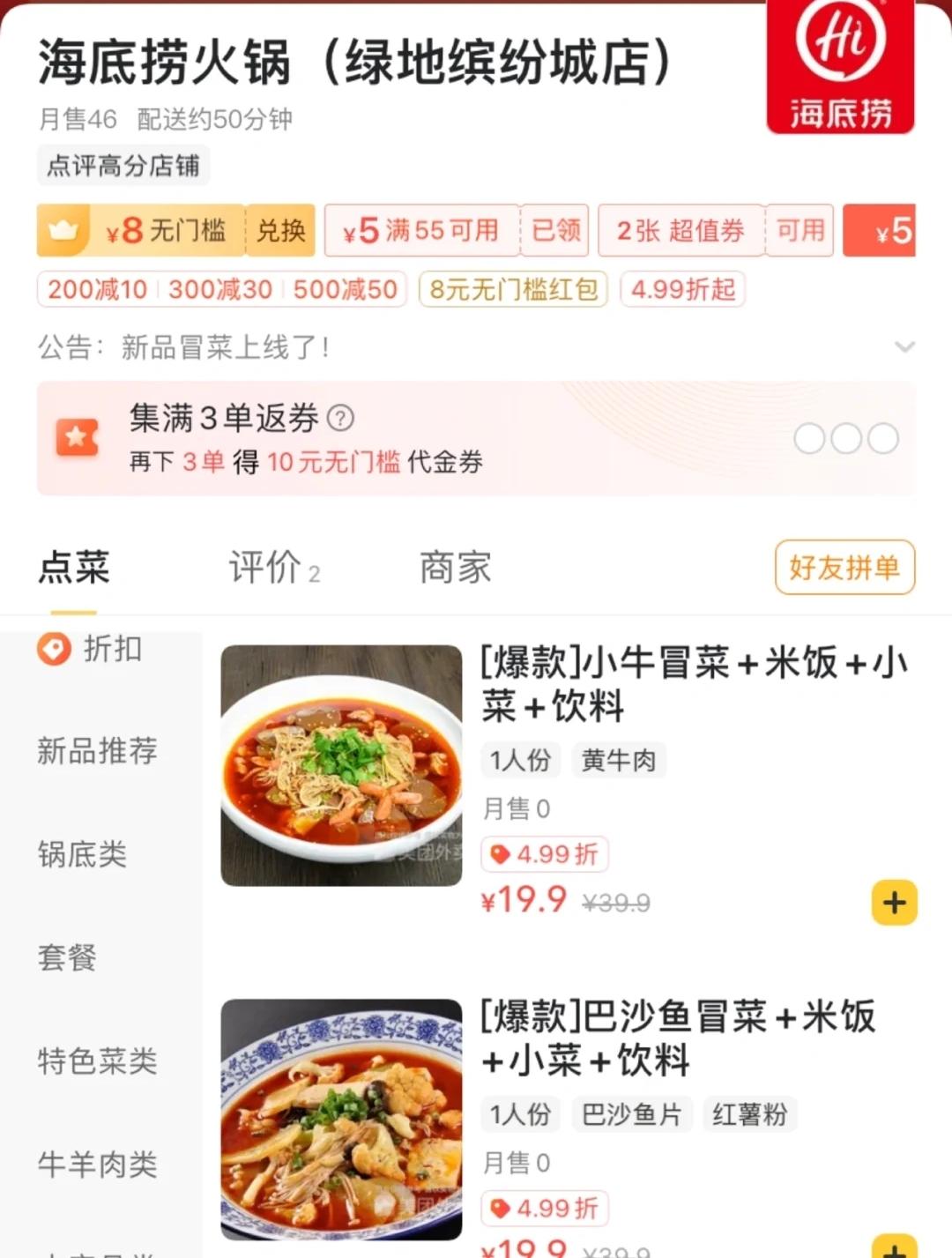 而北京的一位网友,就在海底捞发现了19.9元一份的冒菜外卖套餐。这份套餐包含冒菜、饮料、麻酱、小菜和米饭。