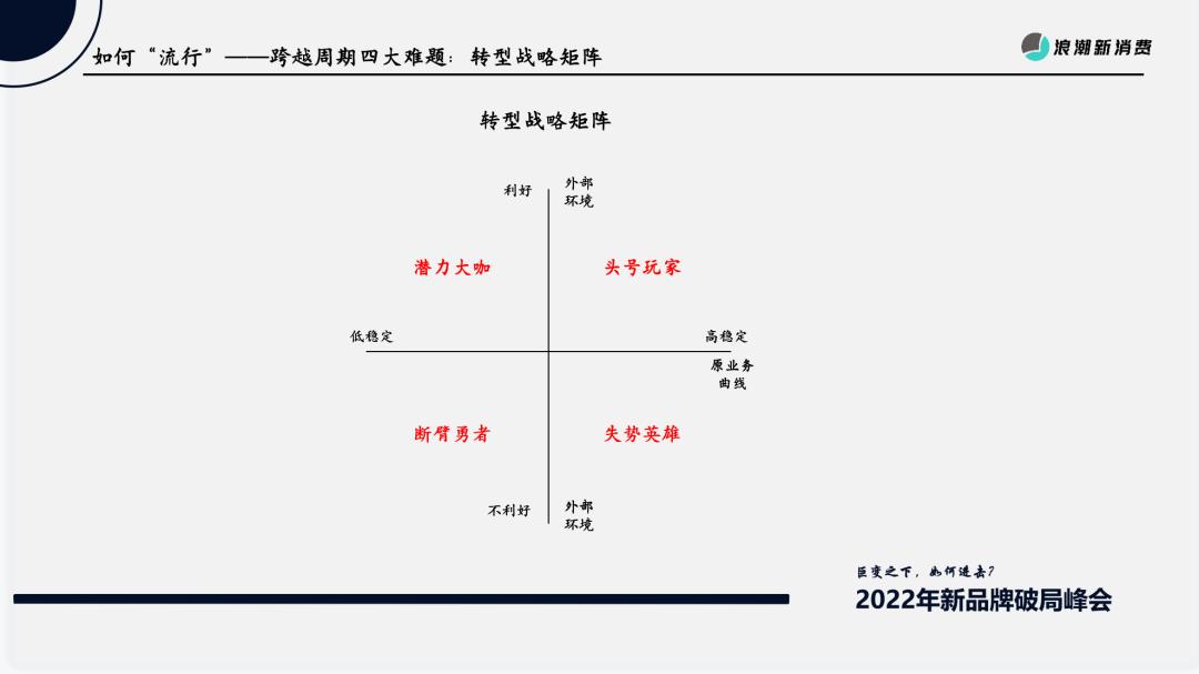 横轴代表的是原有业务曲线的稳定性,越往右越高稳定,纵轴代表外部环境的利好程度。