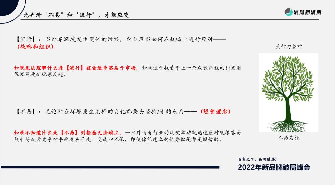 基于这些变化,企业一定要弄清 “不易”和“流行”,也就是什么是变和不变。“不易”为根,“流行”为茎叶。