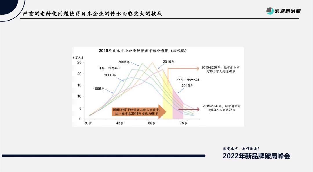 日本现在面临非常严重的传承问题,最核心的点还是老龄化。可以看一下这张图,2015-2020年经营者中有30.6万人达到了70岁,有6.3万人达到75岁。