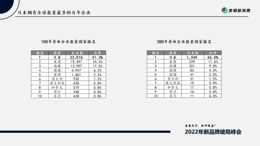 日本就是在转型这块做得非常成功的国家,从百年企业数量来看,按企业寿命100年以上的数量对国家排名,日本现在排在第一,有三万多家百年企业。