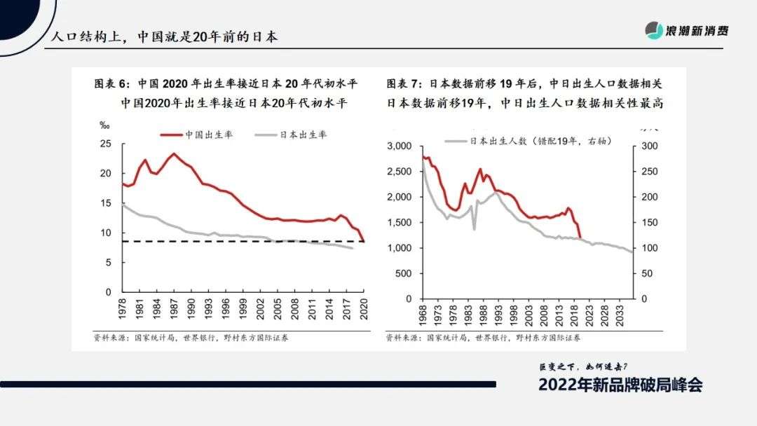 左面这边图说明中国2020年的出生率已经接近日本21世纪初的水平,右面这张图你会发现日本数据往前移19年,出生人口数相关性是最强的。