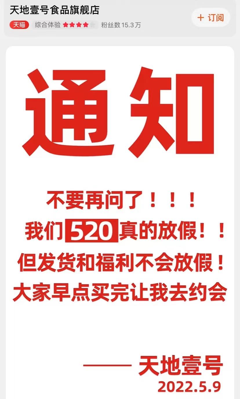 雷达财经注意到,目前天地壹号在其官微、公众号、抖音、视频号等多个平台都对520放假这一消息进行了宣传,就连天地壹号的官方旗舰店和直播间也都为放假消息提供了专门的宣传区域,“不要再问了!我们520真的放假,但发货和福利不会放假!大家早点买完让我去约会!”
