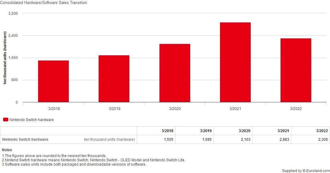 在过去一个财年,任天堂卖出了2306万台Switch游戏机硬件,其中包括1356万台原版Switch、580万台OLED加强版以及370万台Switch Lite。硬件销量同比下滑20.01%。
