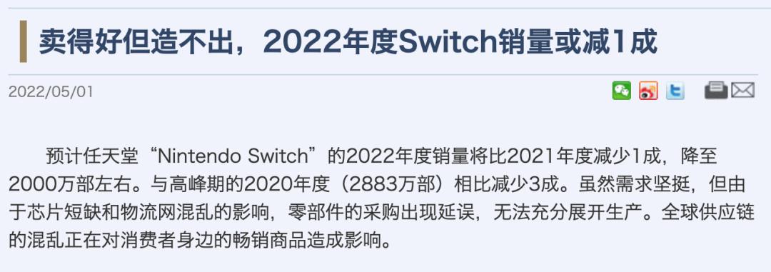 任天堂对于Switch本财年出货量为2100万台的预测,同样基于供应链不稳定所作出的。日经新闻日前更是用“卖得好但造不出”来描述任天堂Switch的销量“困境”。