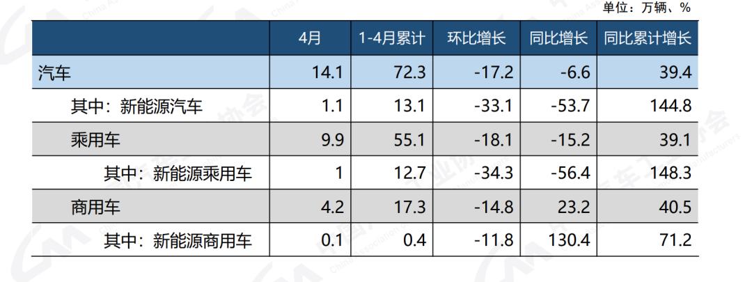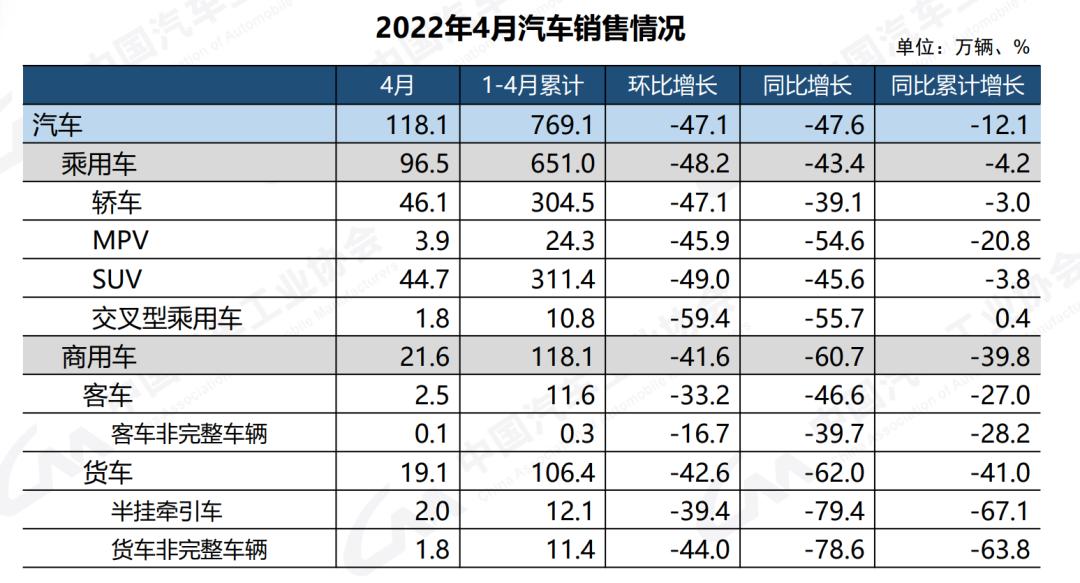 根据中汽协的数据,4月,汽车产销分别达到120.5万辆和118.1万辆,环比下降46.2%和47.1%,同比下降46.1%和47.6%。