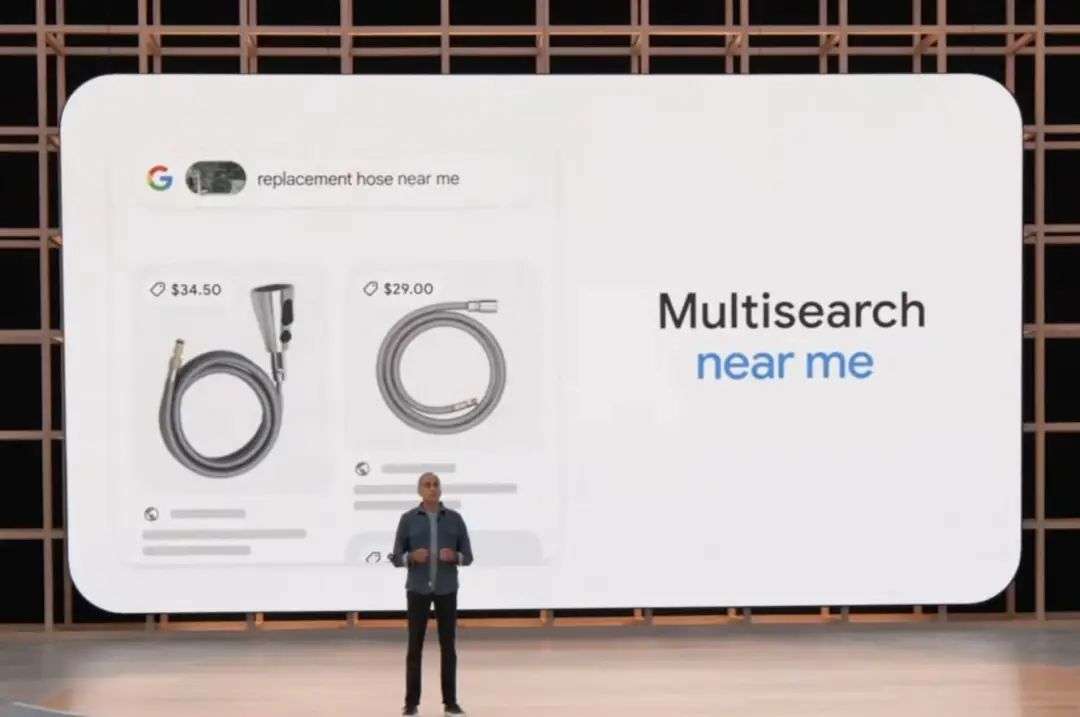 未来,Google 搜索引入 Multisearch near me 功能,说罢 Pichai 就展示了这项功能:拍一张水龙头的照片,再加上一句搜索语:维修这东西的零件,最后用「near me」所结尾,搜索引擎就会在地图上标记出附近能买到这个零件的商店。