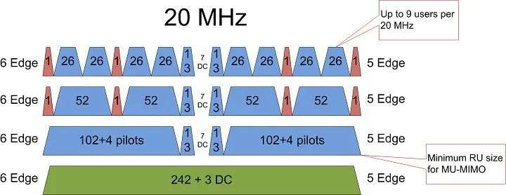 以下图的20MHz带宽为例,经过子载波分配,20MHz可以最多支持9个设备同时接入,40MHz则可以支持18个设备,以此类推。
