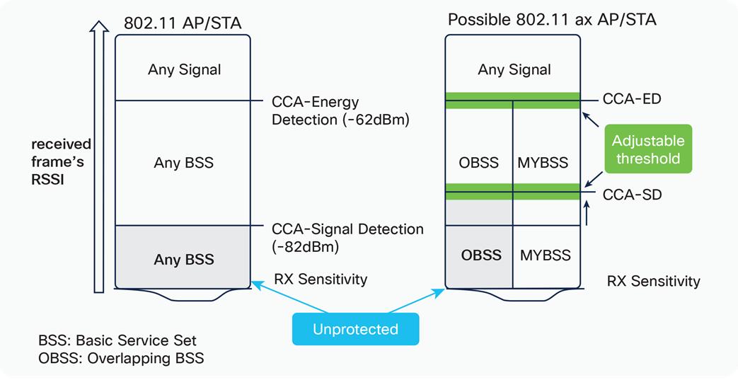 Wi-Fi 6采用了差异化检测门限,给不同颜色码的小区分配不同的检测门限(上图右边)。
