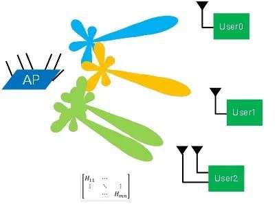 AP由于不受体积和电源限制,可以做到4甚至8根天线。MU-MIMO中的MU指的是多用户(Multiple Users),一个AP使用同样的信道来服务多个不同用户,每路用户分配1-2根天线,每根天线之间信号正交,互不干扰。