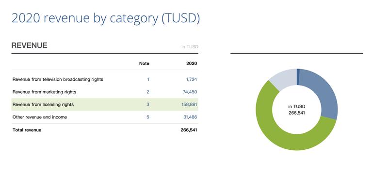 ▲在受到疫情打击的2020年,IP授权部分的收入成为了国际足联营收中的大头,占比达到60%。