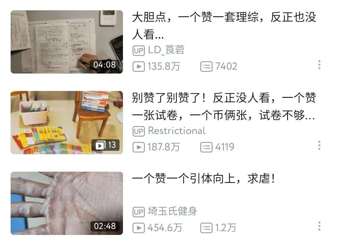 类似的还有“一个赞一份试卷”、“一个赞一次引体向上”等挑战类话题,也是热门备选题材。