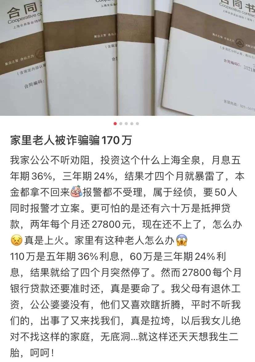 前几天有一位网友在社交平台上诉苦,她公公不听劝阻,拿了170万去“投资”,结果利息只给了4个月就突然停了,现在本金都拿不回来。