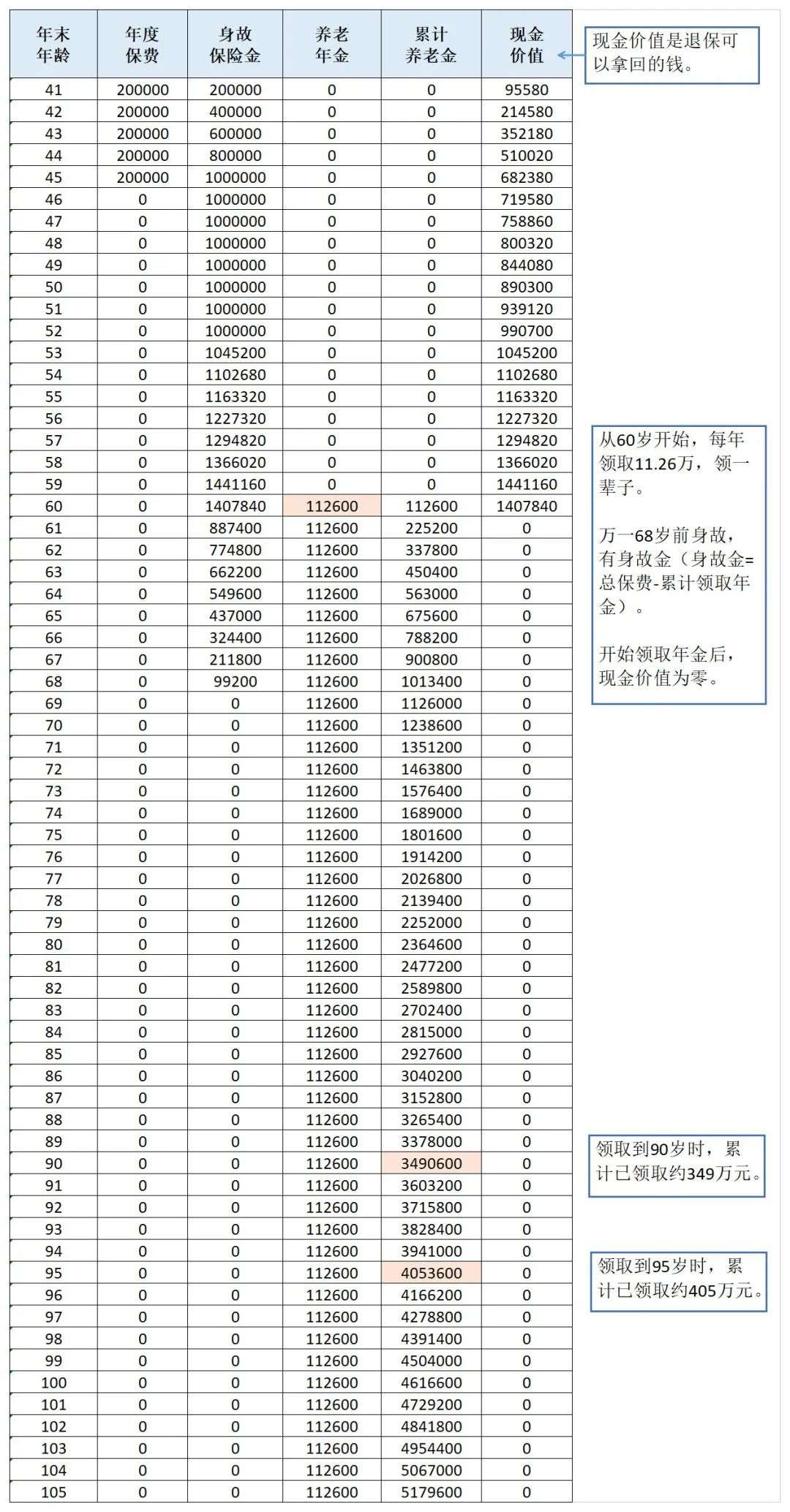 以下面这款产品为例,40岁女性,年交20万,交5年,从60岁开始每年领取11.26万元,领一辈子。领取至90岁时,累计已领取约349万元。