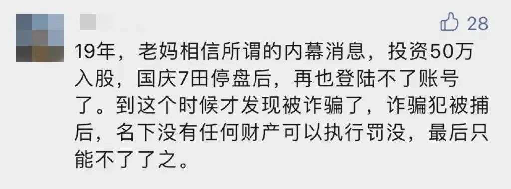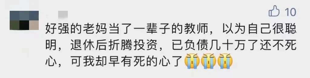 和作者公公婆婆一起“投资”被骗的,还有婆婆的姐姐和姐夫。他俩从金融体系退休,姨爹退休前还是银行领导,总以为自己“宝刀未老”。
