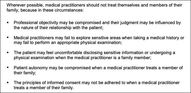 美国医学会的道德准则中指出,医生「通常不应该治疗自己或者其直系亲属」。 英国总医学委员会和新西兰医学委员会也建议,不要向与医生有密切私人关系的任何人提供医疗服务。