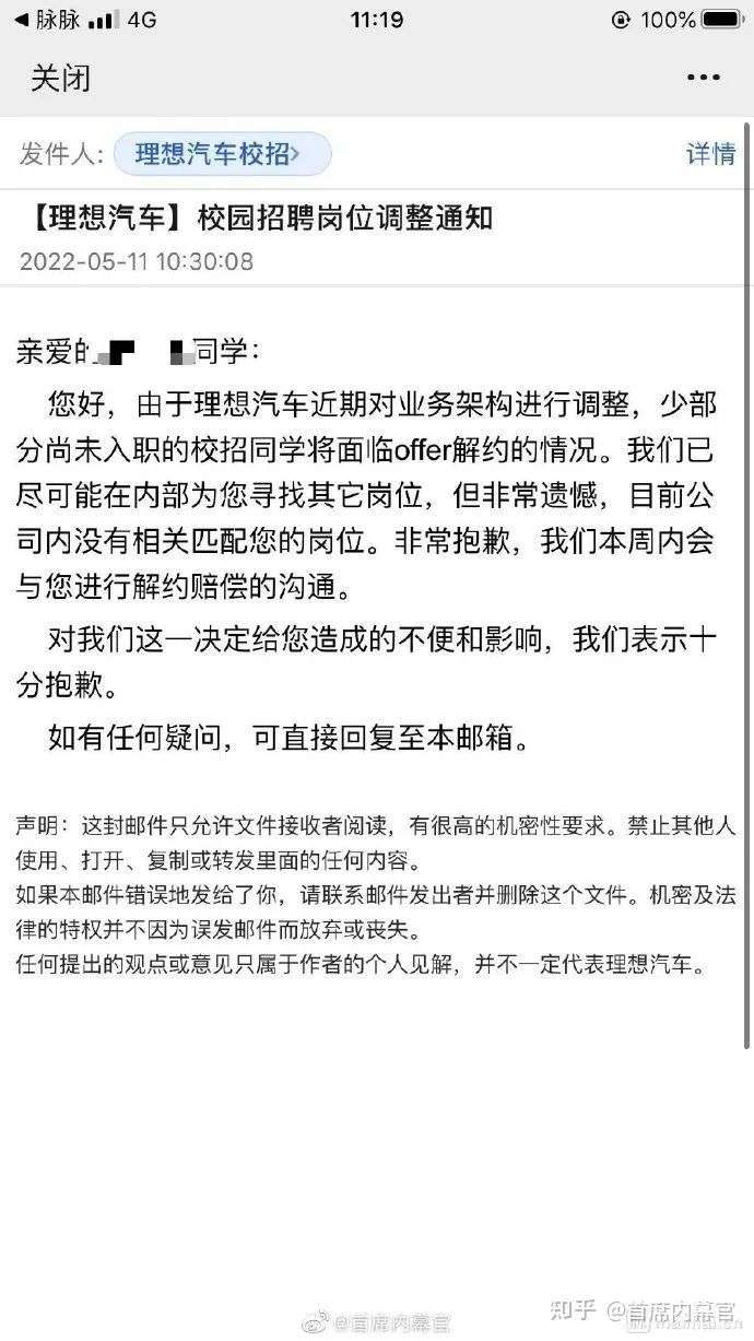 近日,知乎用户“首席内幕管”发文称,理想汽车在五月上旬向不少应届校招生发出了解约邮件。解约邮件称,“由于理想汽车近期对业务架构进行调整,少部分尚未入职的校招同学将面临offer解约的情况。公司已尽可能在内部为校招同学寻找其它岗位,但非常遗憾,目前公司内没有相关匹配的岗位。未来公司将会将进行解约赔偿的沟通,公司对上述决定造成的不便和影响,表示十分抱歉。”
