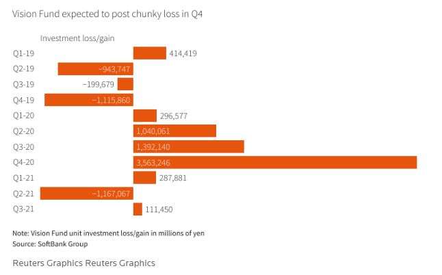 在最新财报周四公布前,软银愿景基金迄今为止最大的投资亏损8251亿日元(约合89亿美元)出现在公司2021财年第二财季(即2021自然年第三季度),当时也值全球股市暴跌。不过该部门随后恢复盈利,在去年第四季度投资收益1090亿日元(约合8.5亿美元)。