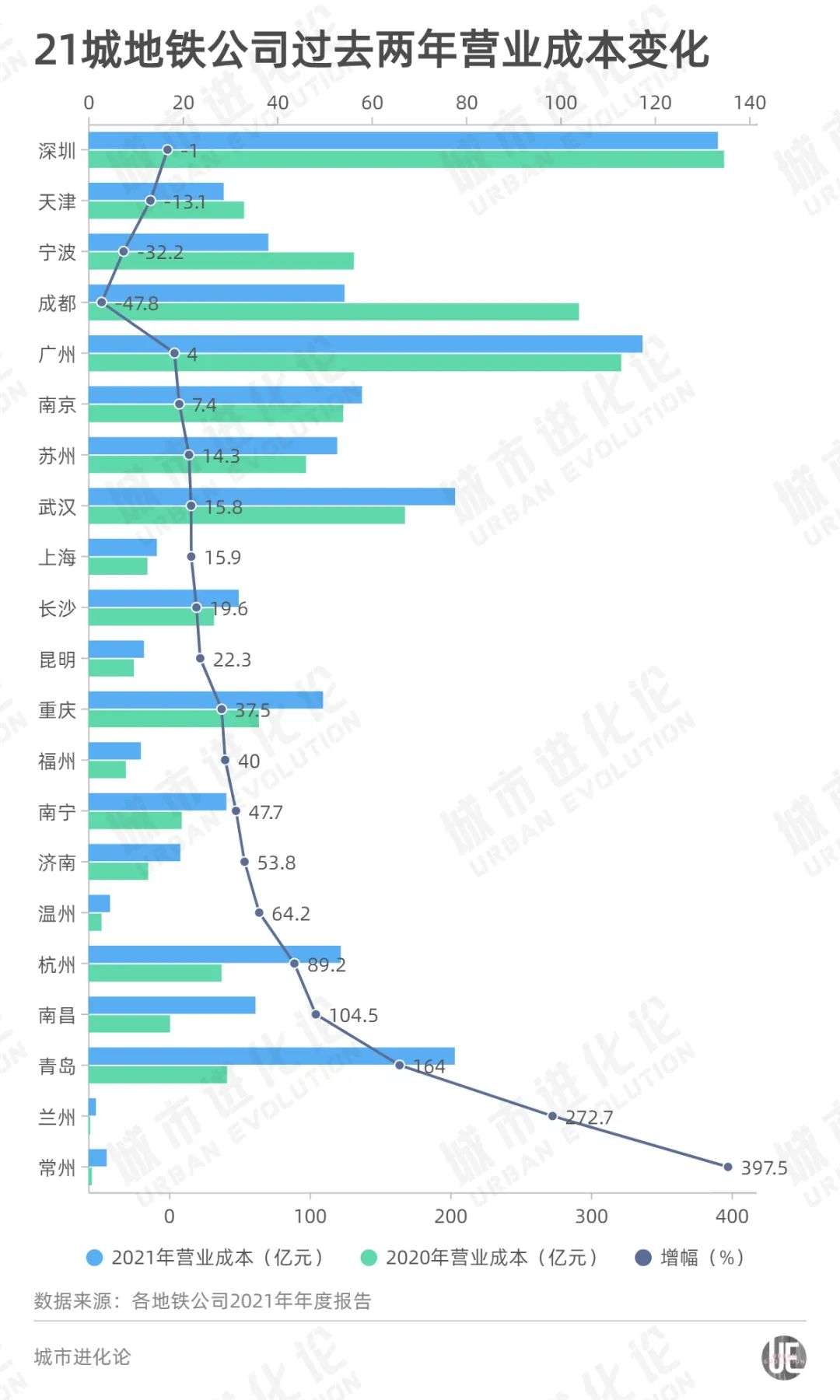 21城中,只有深圳、成都、天津、宁波4城营业成本(不含税金等,下同)下降,其余17城营业成本都较前一年有所增加。其中,常州地铁营业成本增幅高达近400%,兰州增幅超270%,青岛增幅为164%,南昌为104.5%。