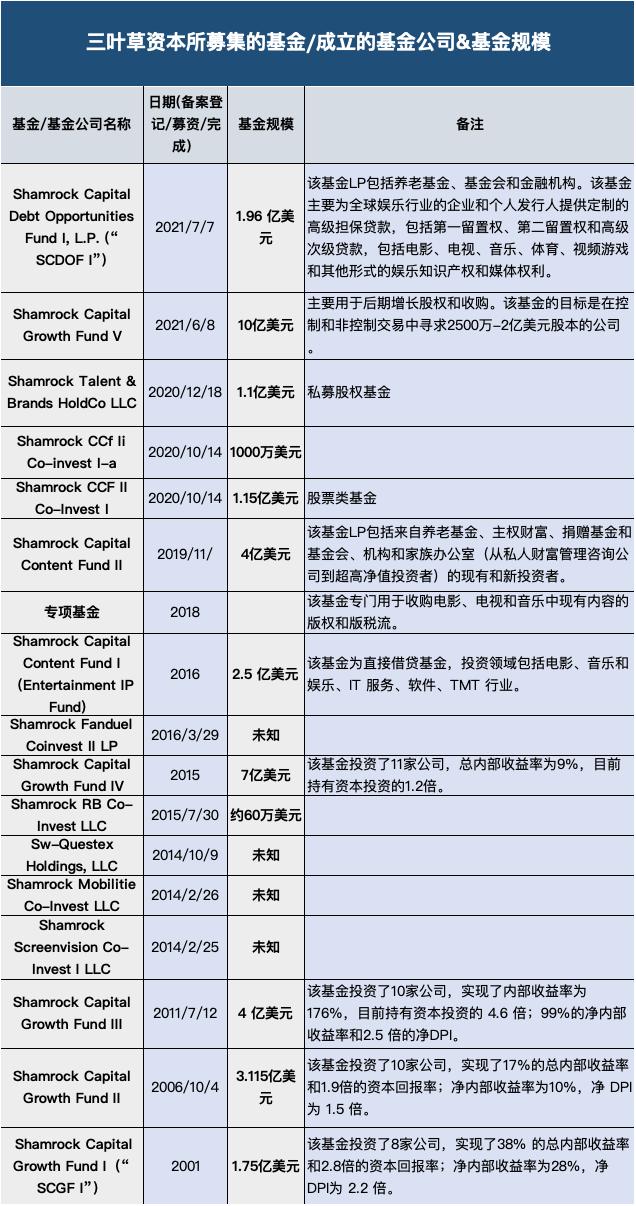 三叶草控股已在广泛的房地产类型和行业以及私募股权交易中投资了超20亿美元,为他们的投资者(包括迪士尼家族)创造了卓越回报。如,截至2019年6月30日,2016年募集的Shamrock Capital Content Fund I净内部收益率为7%。到2020年9月30日,该期基金已承诺投资1.64亿美元。该基金总规模为2.5亿美元。