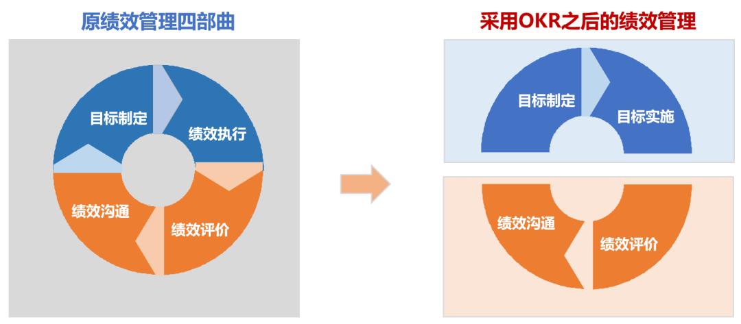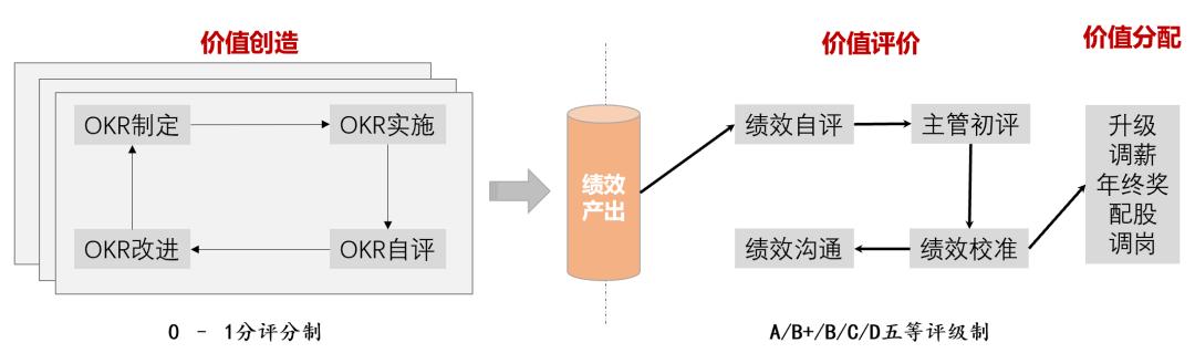 从步骤上来说,OKR模式下的绩效管理是松绑了目标管理和绩效考核之间的关系。用OKR做目标管理,它自成闭环,聚焦价值创造;绩效考核仍在,它不评价目标完成率,只评价OKR这个过程产生的有效绩效产出,两者关系如下图示: