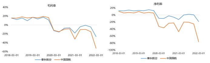 春秋航空由于规模相对较小,成本支出上有一定优势。在费用端,公司凭借网络直销渠道和极简化服务,一定程度上压缩了销售和管理成本。因此,在亏损上相比同行也少了大半。2022Q1,春秋航空的毛利率和净利率分别领先中国航空了26.2个百分点、57.9个百分点。