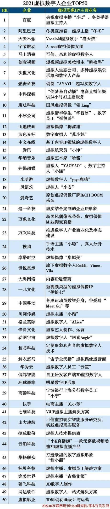 目前,百度已打造了央视网虚拟主持人小C、航天局火星车数字人祝融号、百度App代言人龚俊、理财专员小浦等一系列虚拟数字人。互联网周刊发布《2021虚拟数字人企业排名TOP50》榜单,百度凭借央视虚拟主播、冬奥手语数字人主播,排名中国数字人产业综合实力第一位。