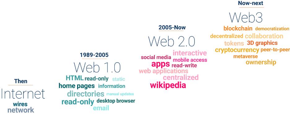 为什么叫Web3?因为人们认为它将是继全球网络(Web1)和用户生成的网络(Web2,社交媒体)之后,互联网的第三次重大变革。