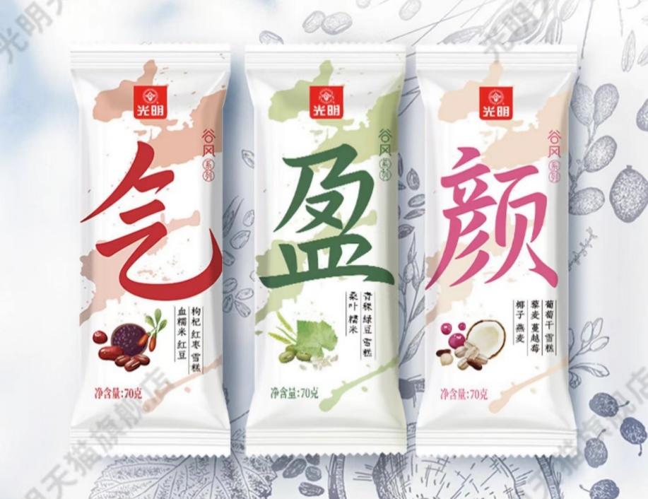 谷物冰淇淋也是植物基的一种,光明推出的谷风系列采用不同谷物并添加膳食纤维,比如“气”雪糕添加血糯米、红豆、枸杞、红枣,“盈”雪糕添加桑叶、糯米、青稞。产品分别命名为气、盈、颜,从名称上给人一种天然质朴的感觉。价格上也相对平价,对于爱美和崇尚健康的人来说不失为一个平替选择。