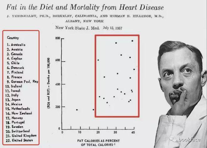 1958年起,他根据自己的假想——脂肪假说,在22个国家中选取了7个符合假说的国家(意大利、希腊、南斯拉夫、芬兰、荷兰、日本和美国),从中收集了的16组成年人的饮食、身体状况以及死亡率等数据进行“科学分析”。