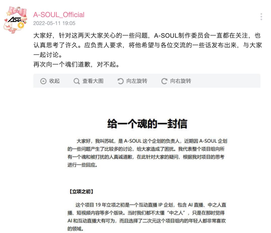 最新消息,A-SOUL的企划负责人苏轼发表《给一个魂的一封信》进行了回应:
