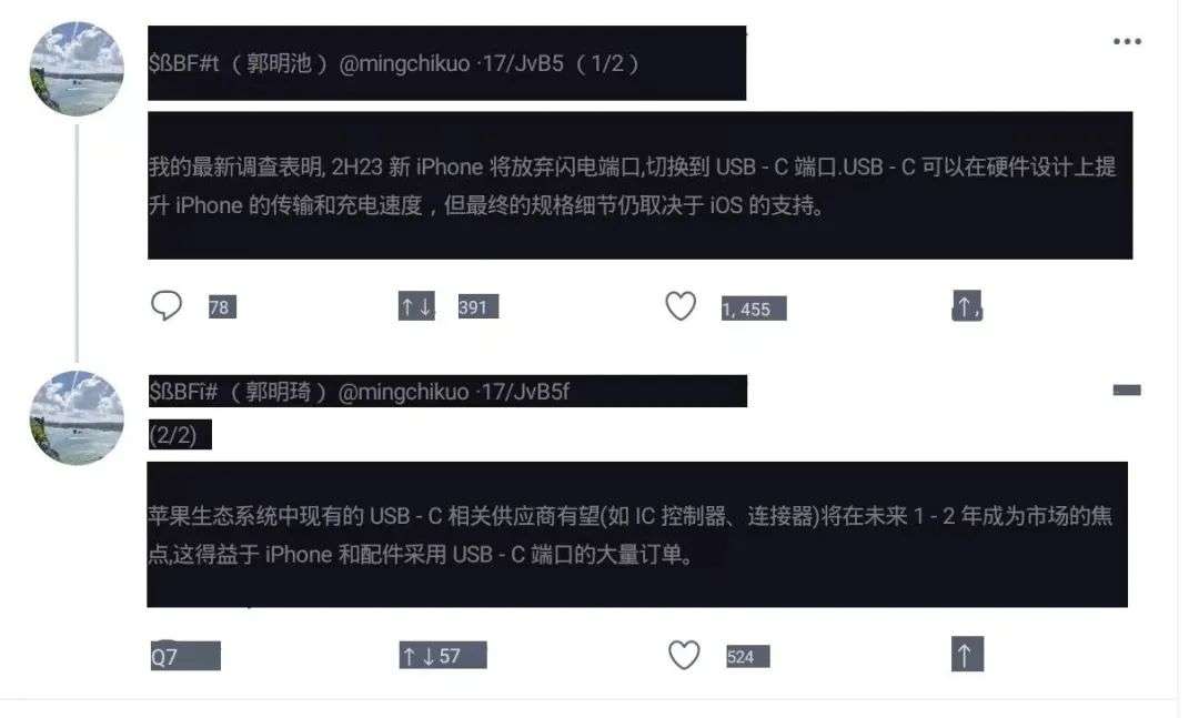 令人欣慰的是,苹果没有坐以待毙,正在暗地里探寻后Lightning时代路线。苹果爆料老朋友,天风国际分析师郭明錤前日在社交平台上表示,2023年的新款iPhone将从Lightning接口切换到兼容性更强的USB-C,提升传输速度、充电速度,也会带动相关供应商增长。