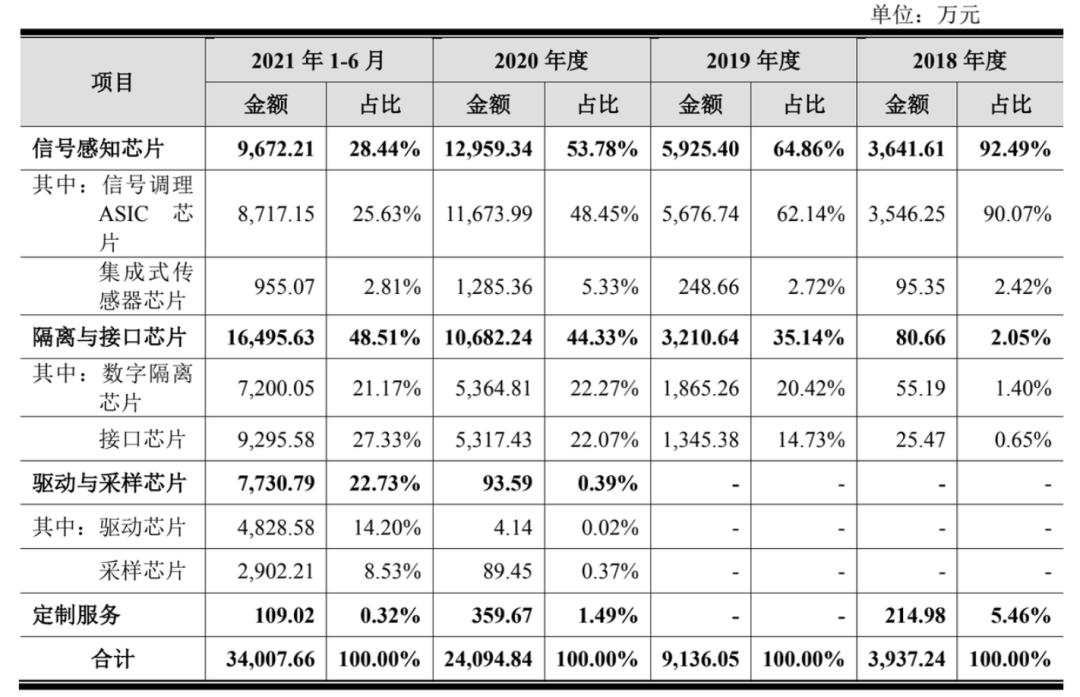 纳芯微招股书披露,三类主要产品,驱动采样芯片售价最高,平均3.8元/颗,信号感知芯片最低,平均0.18元/颗。