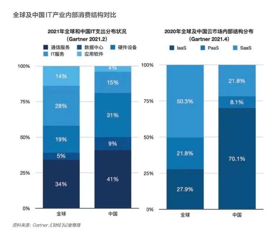 根据《财经》记者整理的数据,2021年全球IT支出中,约42%投入到IT服务与应用软件,相比之下,中国企业仅有19%。此外,在云计算支出中,中国企业只有29.9%投入到“SaaS+PaaS”,而这一指标的全球平均水平则高达72.1%。