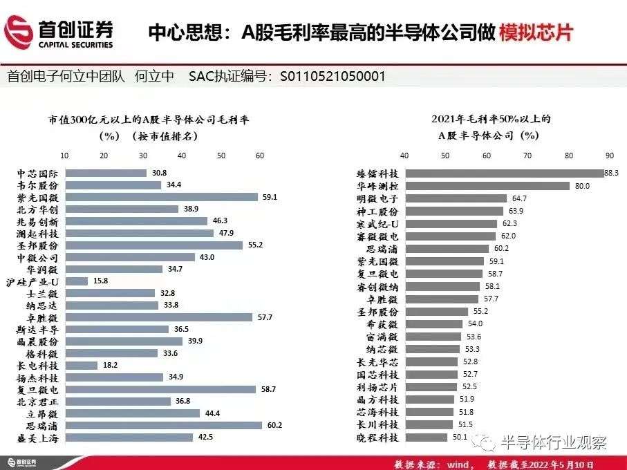 回看国内市场,据首创证券统计信息看到,A股毛利率最高的半导体公司同样是模拟芯片厂商(思瑞浦),毛利率达60.2%,且圣邦股份、卓胜微等多家本土模拟厂商毛利率都处于高位。