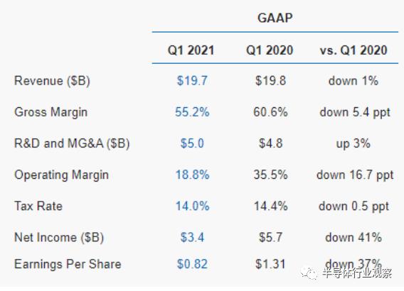 以英特尔2021年Q1季度数据为例,数据中心业务营收55.6亿美元,较去年同期下降20%。尽管英特尔最大占比的个人电脑芯片业务实现增长,但数据中心作为其最赚钱的业务之一,该业务营收下降削弱了整体利润率,季度毛利润率比2020年同期下降了5个百分点以上。