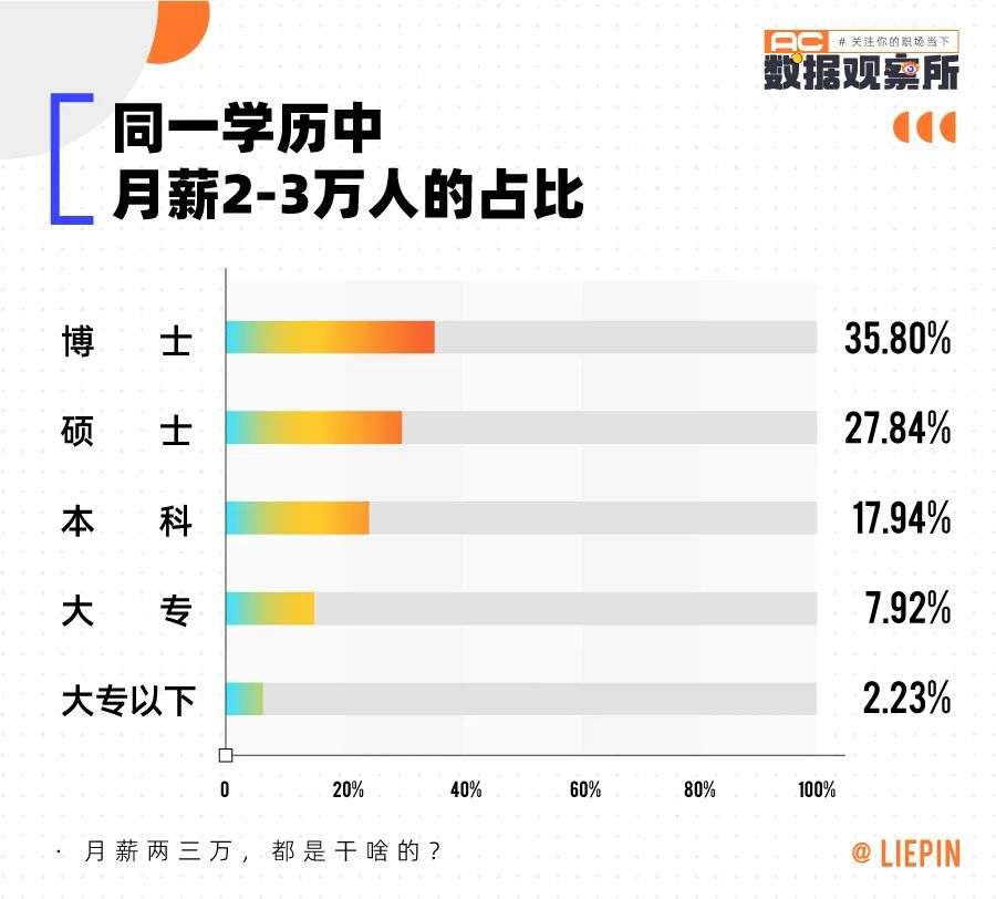 在猎聘平台的大数据里,从大专、本科、硕士到博士随着学历的递增,同一学历中月薪2-3w的占比也随之增多,分别占同一学历人数的7.92%、17.94%、27.84%、35.8%;而学历大专以下仅有2.23%。