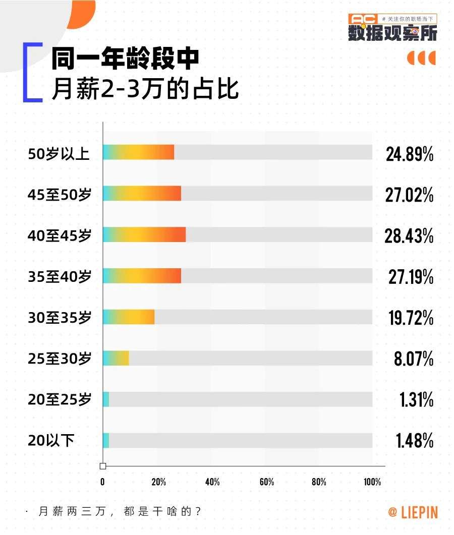 在看完面向所有行业的数据,才发现在薪资这块姜上还是老的辣一些。25岁-30岁间月薪2-3万的人仅有8.07%,但只要咬咬牙等到30岁,很快就能迎来厚积薄发水滴石穿的高光时刻——从30岁-35岁月薪2-3万的人有19.72%。之后的年龄段中,月薪在2-3万的占比都在20%以上。