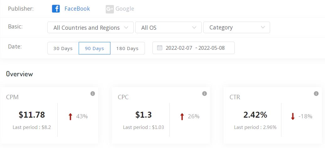 根据 ADCostly 数据显示,过去三个月里,Facebook 的 CPC 成本平均为 1.3 美元,CPM 则为 11.78 美元。