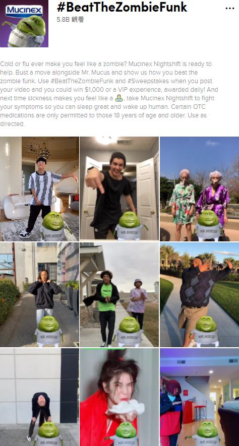 感冒药品牌「Mucinex」在举办的 #BeatTheZombieFunk (击倒僵尸) 挑战赛中,也提供了一个品牌吉祥物“Mucus 先生”作为贴纸。