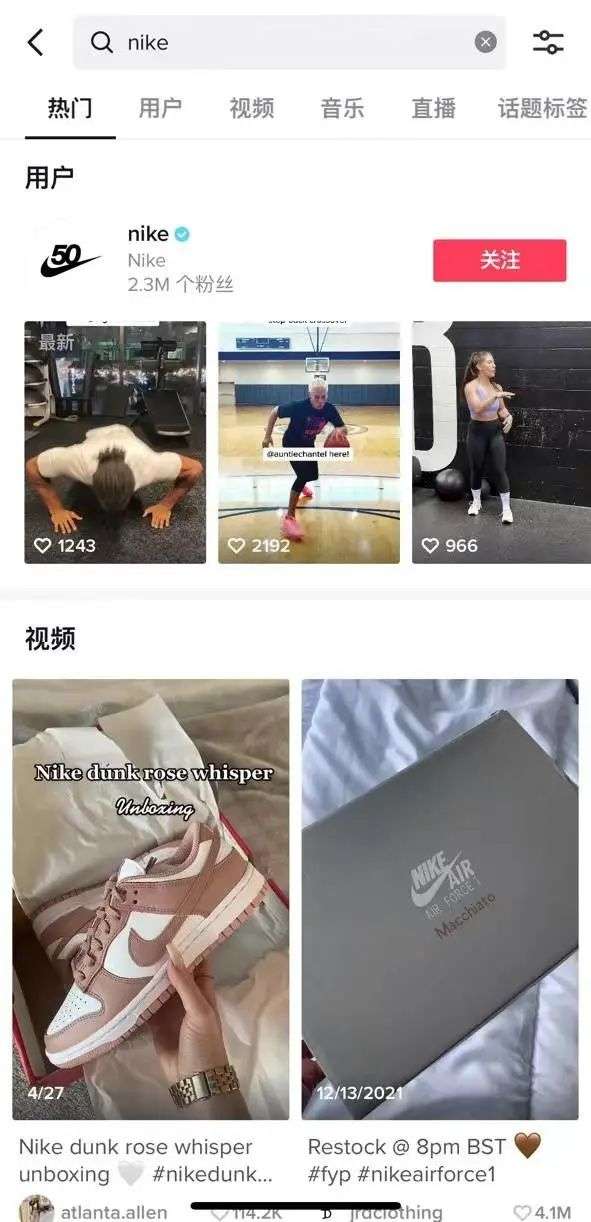 在 TikTok 搜索某品牌名,用户能看到官方账号和互动数据靠前的相关视频。这就意味着,品牌和商家投放的广告,可能会通过搜索获得一定的长尾流量。