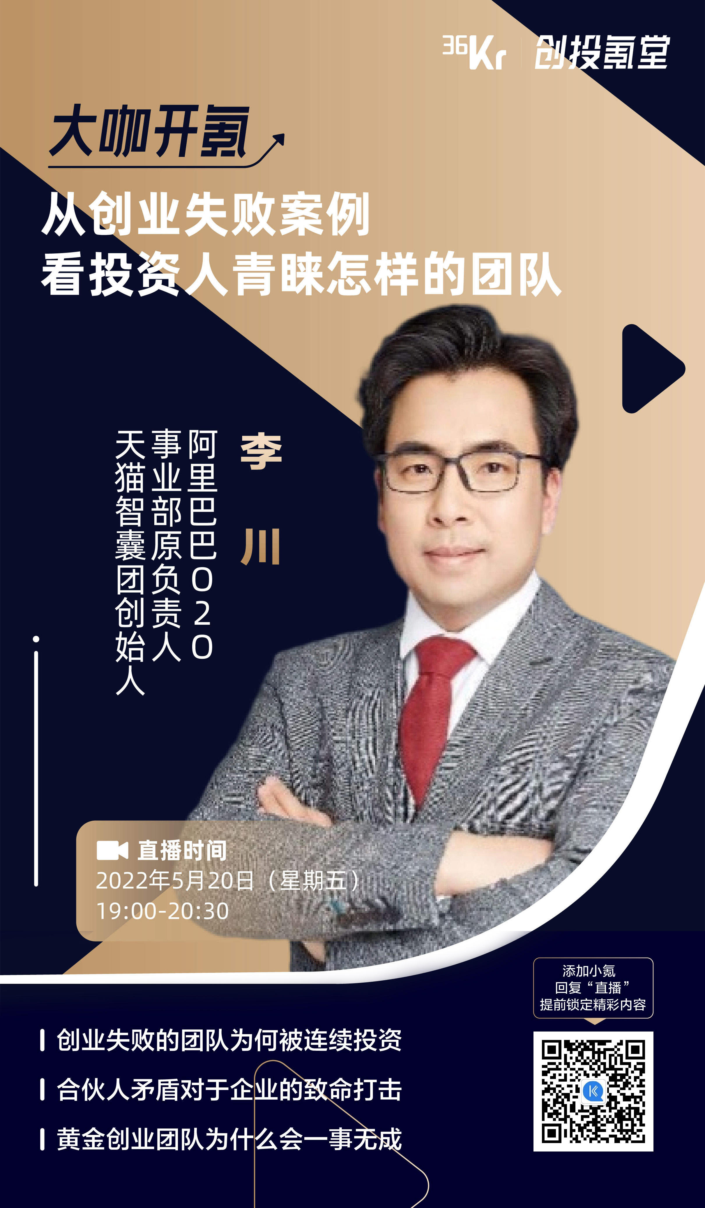 为了让你更好地掌握投资者思维,把握资本世界的底层逻辑,36氪独家邀请阿里巴巴O2O事业部原负责人、天猫智囊团创始人李川,以 “从创业失败案例,看投资人青睐怎样的团队”为题谈谈。