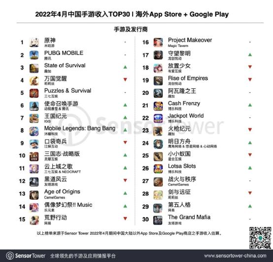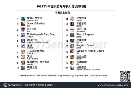 根据Sensor Tower数据显示,2022年4月份中国手游出海收入前十的产品分别是:《原神》、《PUBG Mobile》、《State of Survival》、《万国觉醒》、《Puzzles & Survival》、《使命召唤手游》、《Mobile Legends: Bang Bang》、《口袋奇兵》、《三国志·战略版》。